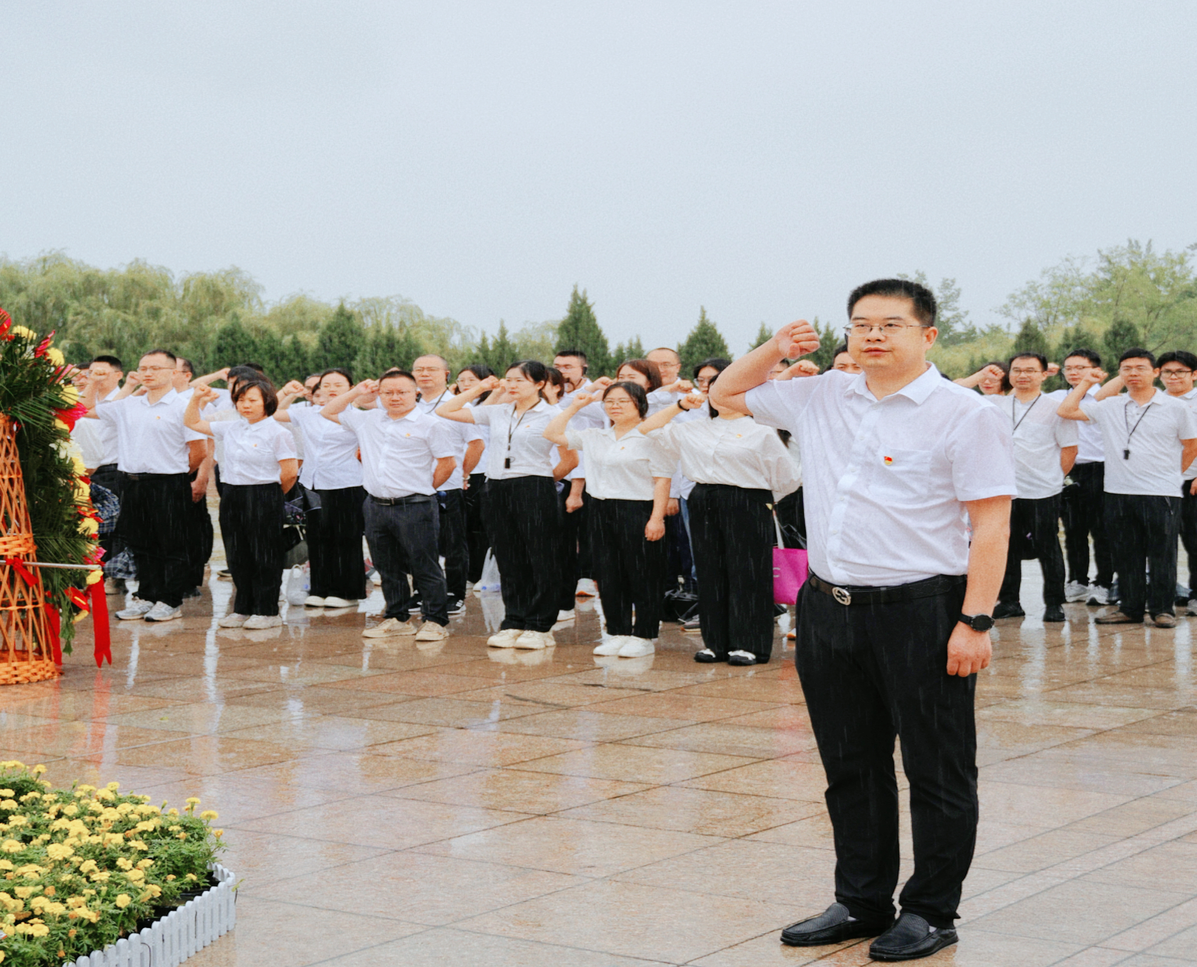 西柏坡广场上,五大书记铜像矗立,全体人员整齐列队,怀着无比崇敬之情向领袖伟人敬献花篮并深深鞠躬。随后,大家高举右拳,面向党旗,重温入党誓词,重拾入党初心。